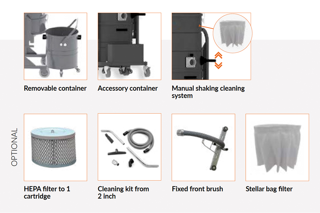 This unit is a multi-purpose industrial machine with a compact design, designed for ease of use and easy handling, ideal foroperating in small spaces. Equipped with three high-performance suction motors, each manageable via independent switches, itallows the selection of the power best suited to operational needs.The manual shaking cleaning system ensures effective removal of residues, quickly and efficiently preventing the filter fromblocking quickly and efficiently. The machine is manufactured with a steel body and tank which provides a tobust and durableunit. The tank is easy to remove and reinstall owing to a practical conveniently located handle. The chassis can be integrated witha fixed front brush for suction, making it ideal for operations in open areas.Perfect for collecting dust, liquids, particles and other materials, it is designed for high performance in intensive and continuousworking environments.